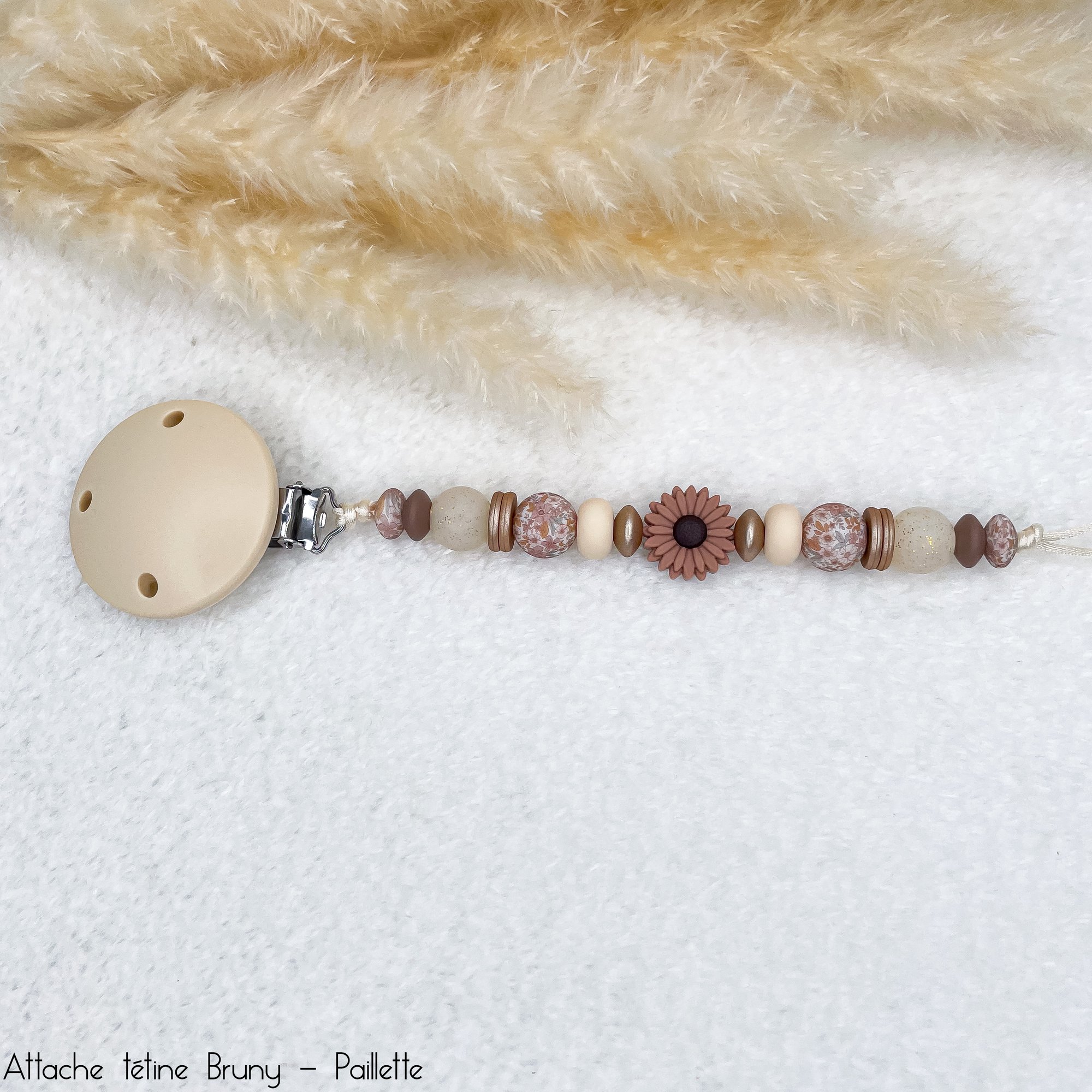 Attache tétine Paillette : Bruny, chocolat glacé, paillettes dorées, or light & marguerite argan ✨