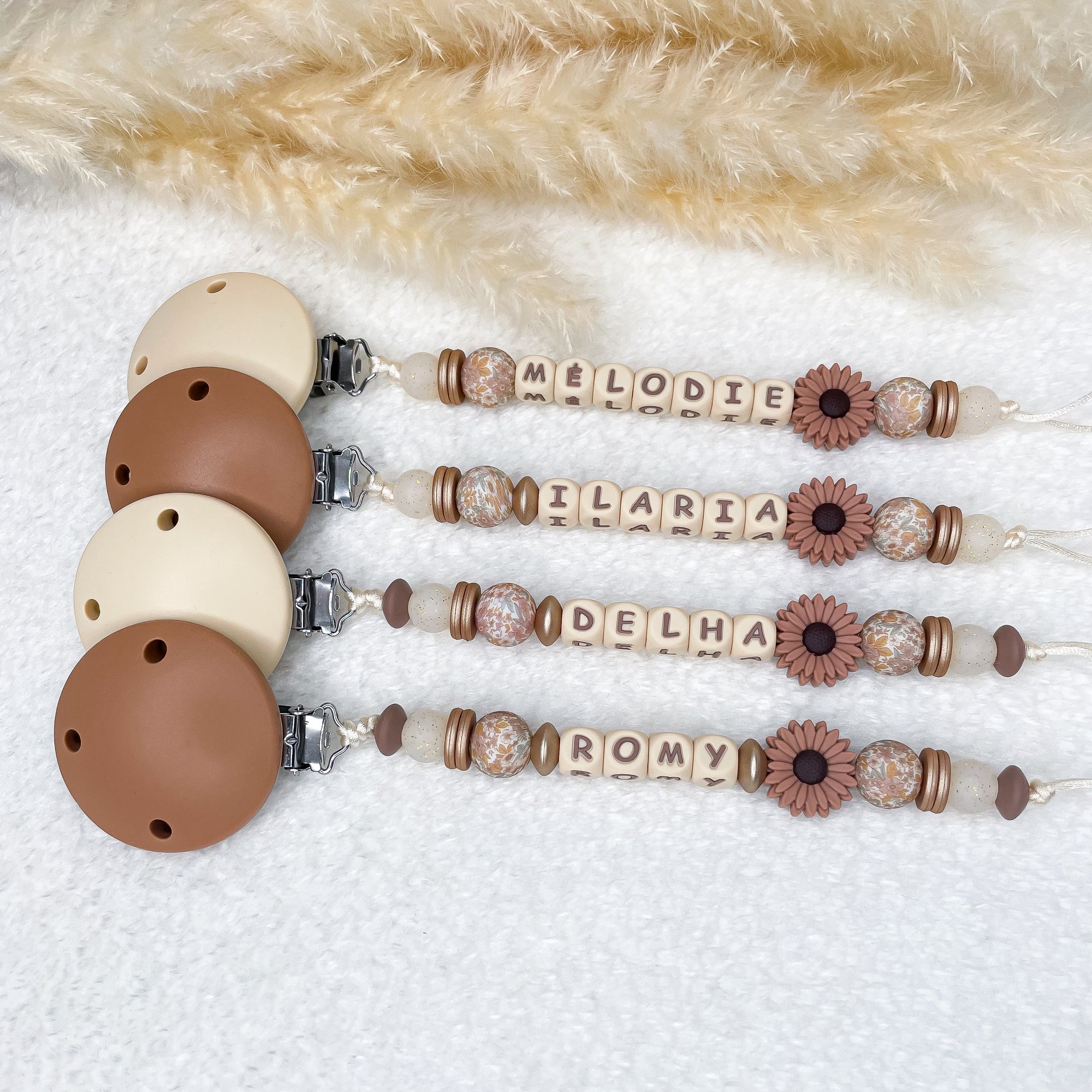 Attache tétine Paillette : Chocolat glacé, paillettes dorées, or light, bruny & marguerite argan 🤎